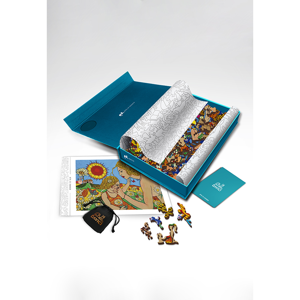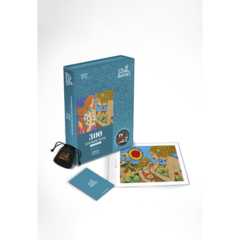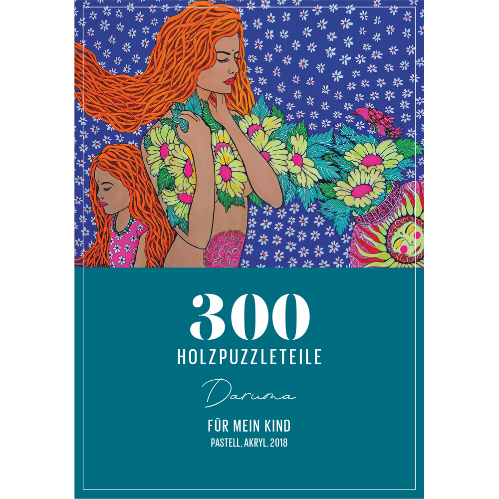 "Für mein Kind. Kollektion Nr. 2. KünstlerIn Daruma. Pastell, Akryl, 2018 DAVICI ist der aus Russland stammende Vorreiter im Bereich von Holzpuzzles mit fantasie-vollen Formen. Wie ein Buch erzählt die Box in deinen Händen die Geschichte der Kunstwerke mit Helden, Märchen und rätselhaften Handlungen. DaVICI steht für einzigartige Puzzles aus hochwertigem Birkenholz mit extravaganten Formen und Liebe zum Detail. Durch präzises Laserschneiden passen die aufwendig geformten Teile perfekt ineinander. In dieser Welt der Puzzles erwachen Menschen, Vögel und wilde Tiere, Könige und Wanderer, Sterne und Plane-ten zum Leben. Die Motive der Puzzles basieren auf Gemälden großer russischer Künstler. Das Gemälde des Künstlers ergibt in Kombination mit den Puzzleteilen, die auf die Geschichte des Autors abgestimmt sind, ein vollkommenes Meisterwerk. Beim Zusammensetzen der intellek-tuellen DAVICI Puzzles tauchst Du in eine erstaunliche Welt voller Illusionen, Geheimnisse und Mysterien ein. Ein haptisches Vergnügen mit großartigen Details und angenehmem Duft nach Holz. Die Puzzles von DAVICI schaffen wundervolle Erinnerungen und kostbare Gefühle, und beleben etwas, das wirklich wertvoll ist."