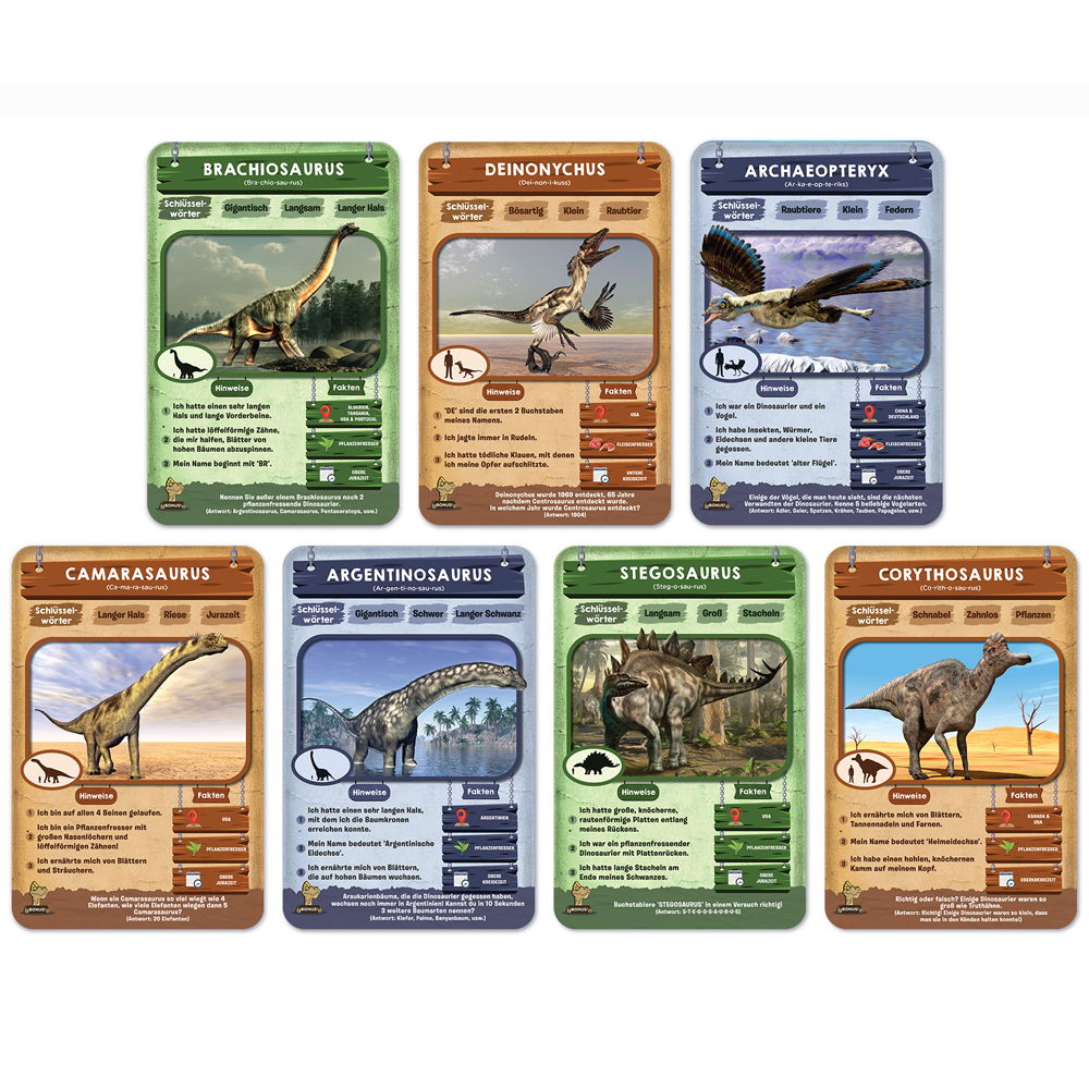 "Ein fesselndes Fragespiel erwartet dich - deine Mission: Errate den Dinosaurier auf der Spielkarte! Du kannst bis zu zehn geschickte Fragen stellen, deine Überlegungen sorgfältig anstellen und deine Hinweiskarten taktisch nutzen, um der Erste zu sein, der sieben Spielkarten ergattert. Sei bereit für ein aufregendes Abenteuer in der Welt der Dinosaurier!"