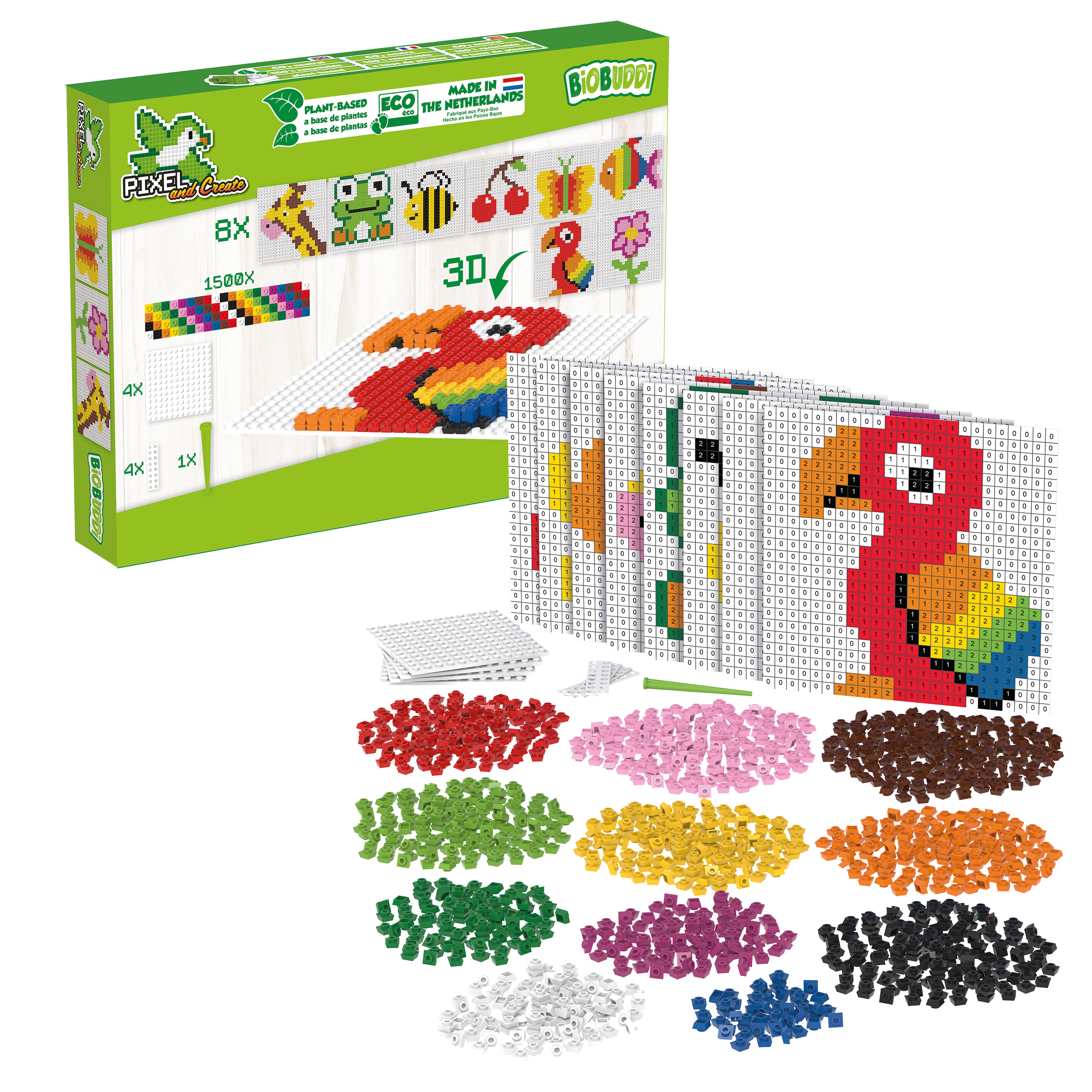 Zeigen Sie Ihre kstlerische Seite BiOBUDDi Pixel and create ist die neueste Art, seine kstlerische Seite zu zeigen. Diese nachhaltigen Blke, hergestellt in den Niederlanden, geben Ihnen die Freiheit, alle Arten von verschiedenen Kreationen in 2D und 3D zu machen. Mit diesem Starterset knen Sie mit Pixel and Create loslegen. Es garantiert tagelangen Pixelspa Das Starterset besteht aus 1500 umweltfreundlichen Pixelblken, einem Entferner, 8 verschiedenen Beispielkarten, 4 Bauplatten und 4 Kupplungsstken. Machen Sie einen coolen Frosch oder einen lustigen Papagei Pixel and create ist eine lustige Art, seiner Kreativit freien Lauf zu lassen. Mit den Beispielkarten kannst du auf einfache Weise lustige Strukturen erstellen, zum Beispiel einen coolen Frosch oder einen lustigen Papagei. Wenn Sie alle Beispielkarten gebaut haben, knen Sie mit Ihren eigenen Ideen loslegen. Heute pixelig werden Jedem Set von Pixel and Create liegt immer ein praktischer Blockentferner bei, mit dem man alle Blke leicht von der Bauplatte entfernen kann. Das Pixel and Create ist ein Spaf Jung und Alt mit einem empfohlenen Alter von 4 Jahren und ter.