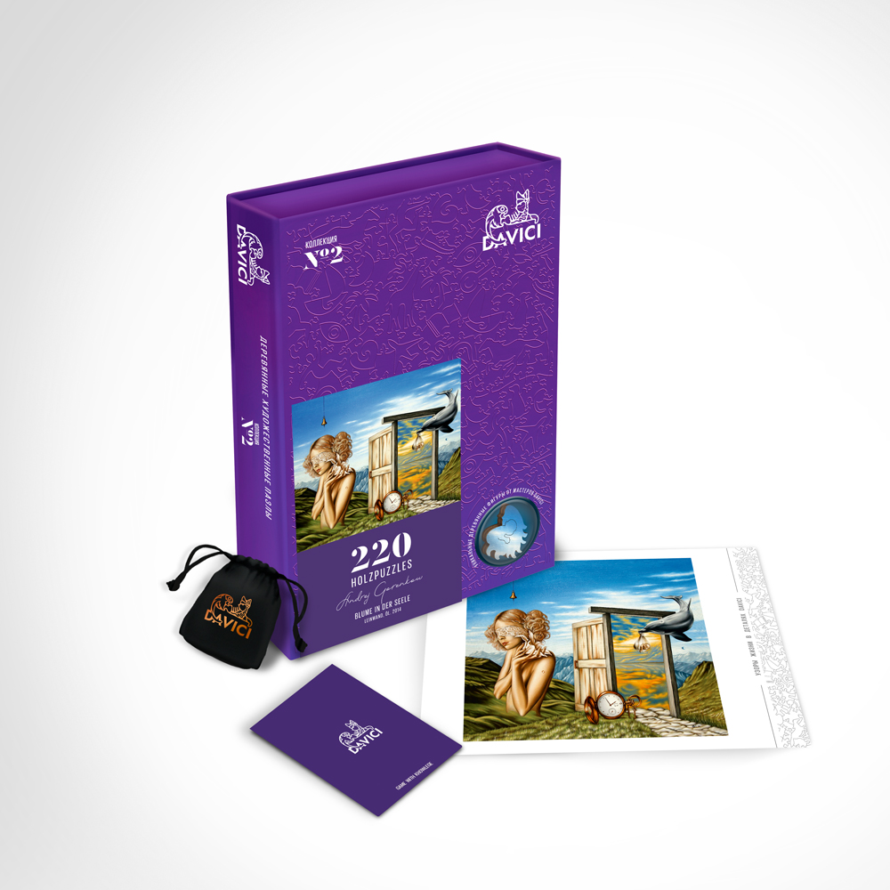 Blumenseele. Kollektion Nr. 1. KstlerIn Andrej Gorenkow. Leinwand, , 2014 DAVICI ist der aus Russland stammende Vorreiter im Bereich von Holzpuzzles mit fantasie-vollen Formen. Wie ein Buch erzlt die Box in deinen Hden die Geschichte der Kunstwerke mit Helden, Mchen und rselhaften Handlungen. DaVICI steht f einzigartige Puzzles aus hochwertigem Birkenholz mit extravaganten Formen und Liebe zum Detail. Durch prises Laserschneiden passen die aufwendig geformten Teile perfekt ineinander. In dieser Welt der Puzzles erwachen Menschen, Vel und wilde Tiere, Kige und Wanderer, Sterne und Plane-ten zum Leben. Die Motive der Puzzles basieren auf Gemden gror russischer Kstler. Das Gemde des Kstlers ergibt in Kombination mit den Puzzleteilen, die auf die Geschichte des Autors abgestimmt sind, ein vollkommenes Meisterwerk. Beim Zusammensetzen der intellek-tuellen DAVICI Puzzles tauchst Du in eine erstaunliche Welt voller Illusionen, Geheimnisse und Mysterien ein. Ein haptisches Vergnen mit grortigen Details und angenehmem Duft nach Holz. Die Puzzles von DAVICI schaffen wundervolle Erinnerungen und kostbare Gefle, und beleben etwas, das wirklich wertvoll ist.