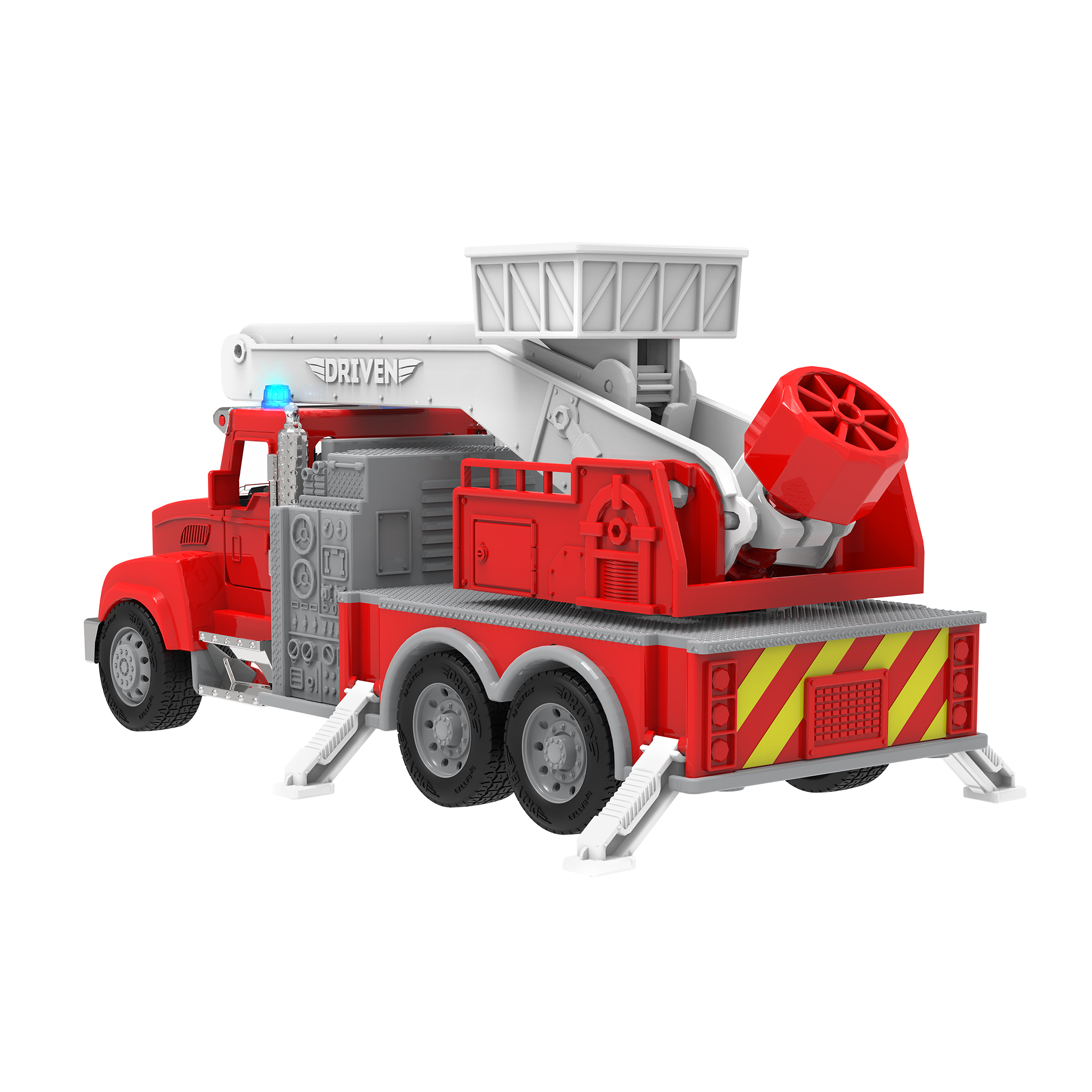 Erkunde die vielen tollen Features dieses coolen Feuerwehrautos von Driven - zum Beispiel die sich fnenden Ten und die Motorhaube, die sich anheben lst! Mit der ausfahrbaren Drehleiter erreichst du jedes Ziel! Rette deine Nachbarn aus einem Gebde und hilf ihnen, in den Korb zu steigen, der sich am Ende der Leiter befindet. Durch deine Rettungsaktion wirst du zum Held der Nachbarschaft. Und f Extraspabeim fantasievollen Spielen sorgt die realistische Kombination aus Licht und Sound!