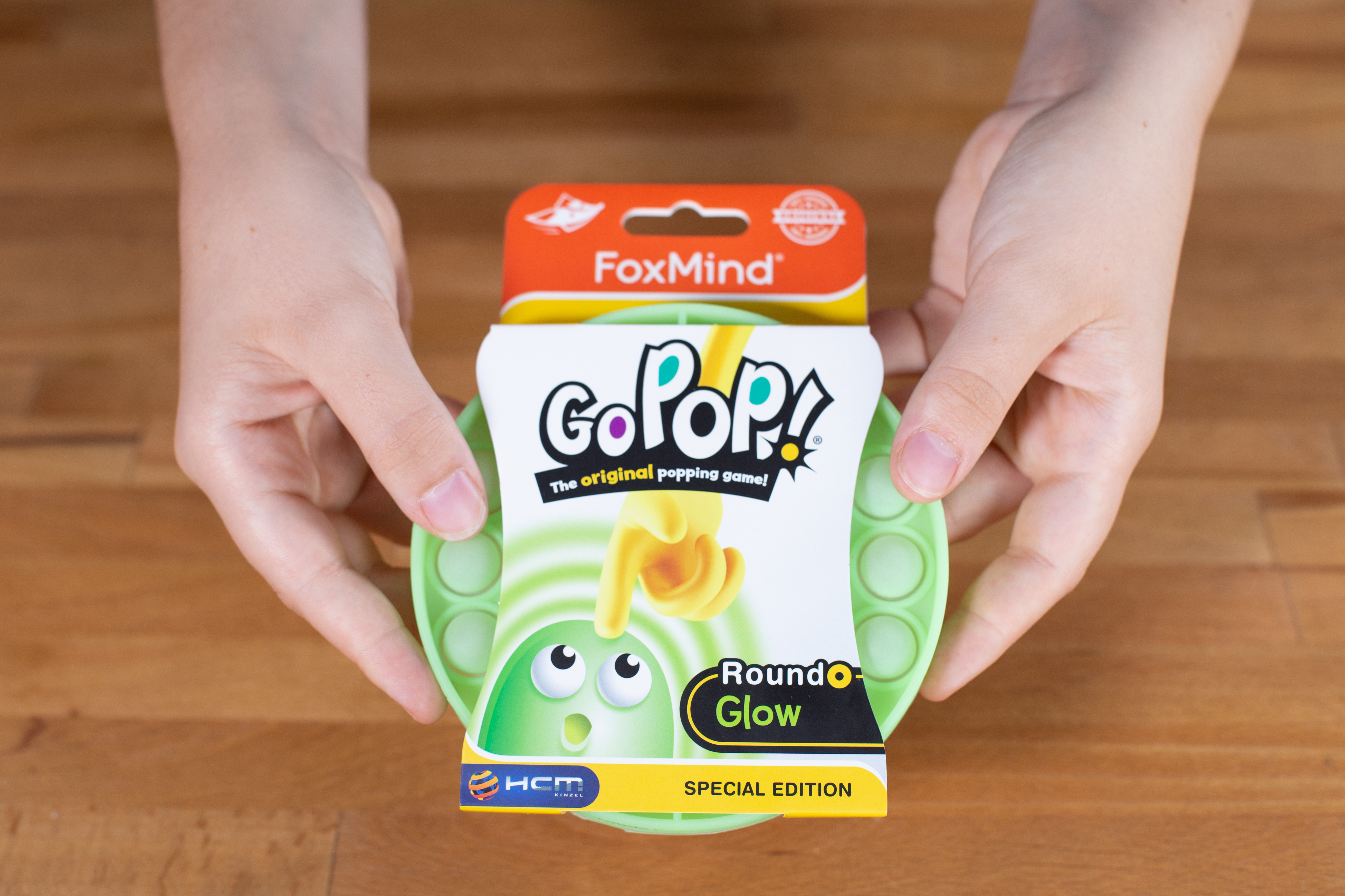 "GoPop™ - The clever popping game! So gehts: Drücke mit jedem Spielzug beliebig viele Bubbles innerhalb einer Reihe nach unten und bringe deinen Mitspieler dazu, die letzte Bubble auf dem gesamten GoPop™ Spielfeld zu drücken. Lustig, schnell und einfach genial! GoPop™ ist das Original Bubble Fidget und ein einfaches und cleveres Logikspiel für 2 Spieler, geeignet für Kinder und Erwachsene. Lasst euch nicht von der einfach aussehenden Form des originellen Bubble-Spiels täuschen. GoPop™ ist das neue Trend Fidget Game! Für GoPop™ gibt es einfache und fortgeschrittene Regeln. Dank der kompakten Größe und des langlebigen Materials habt ihr überall und jederzeit Spaß mit dem grenzenlose Bubble-Spiel GoPop™. Der GoPop™ Roundo in der Glow In The Dark Edition, leuchtet im Dunkeln"