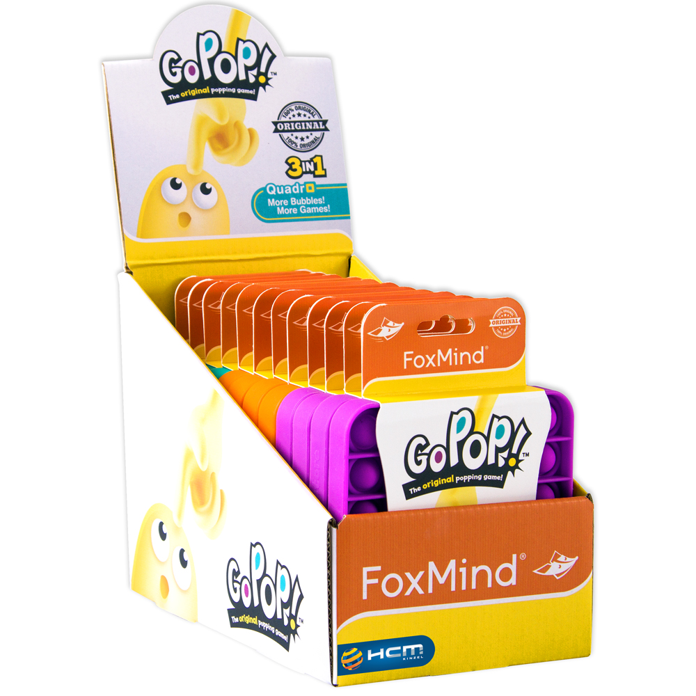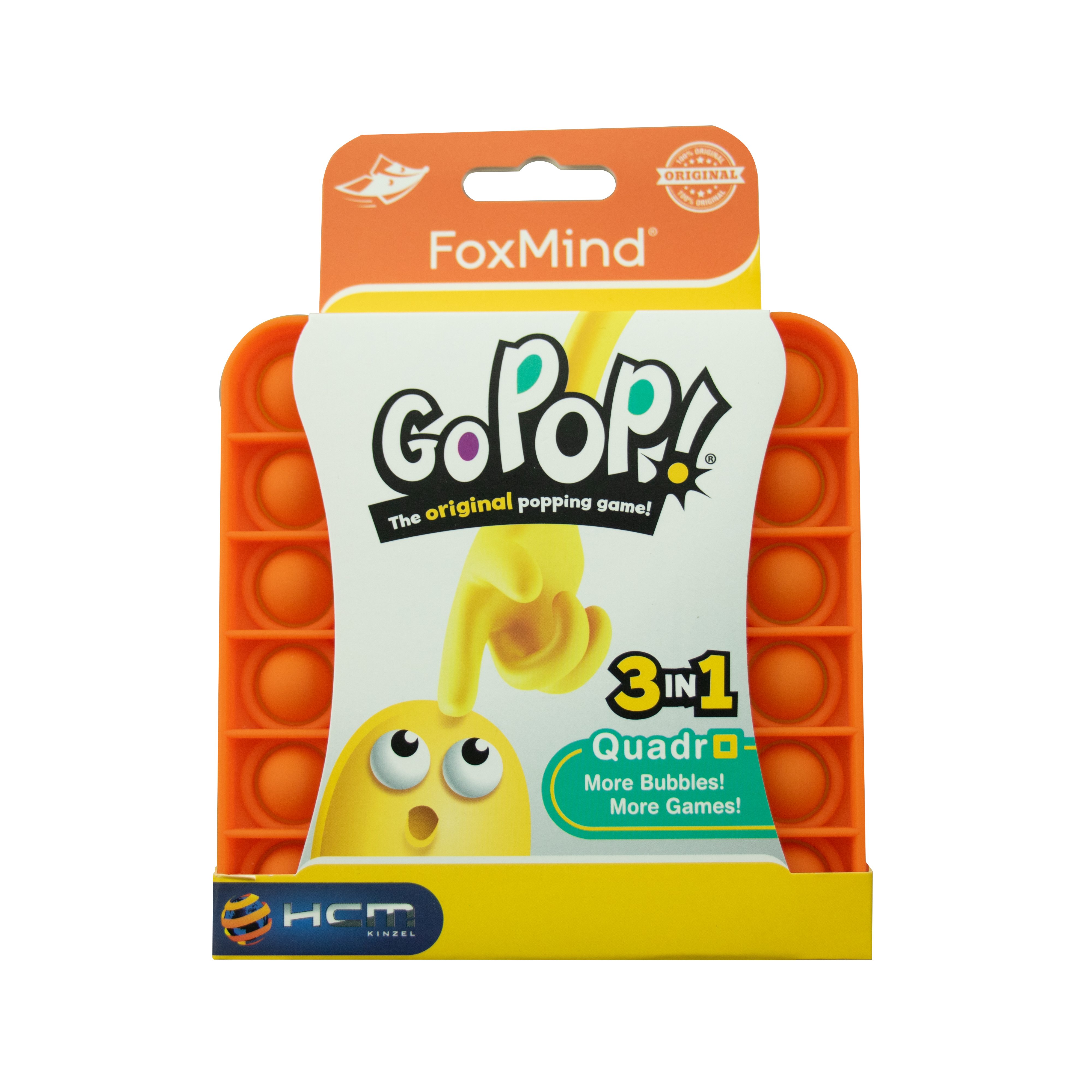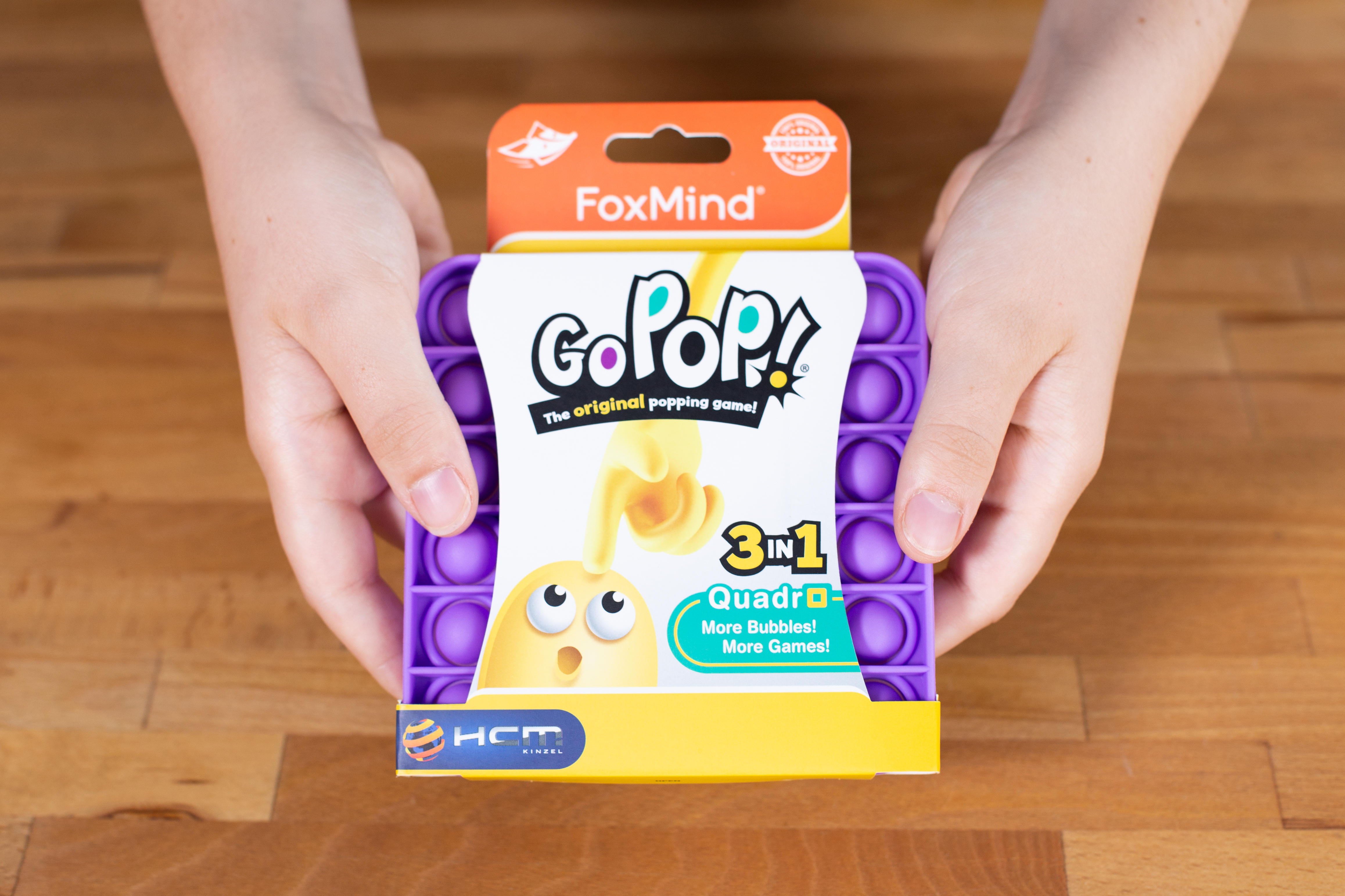 "GoPop™ - The clever popping game! So gehts: Drücke mit jedem Spielzug beliebig viele Bubbles innerhalb einer Reihe nach unten und bringe deinen Mitspieler dazu, die letzte Bubble auf dem gesamten GoPop™ Spielfeld zu drücken. Lustig, schnell und einfach genial! GoPop™ ist das Original Bubble Fidget und ein einfaches und cleveres Logikspiel für 2 Spieler, geeignet für Kinder und Erwachsene. Lasst euch nicht von der einfach aussehenden Form des originellen Bubble-Spiels täuschen. GoPop™ ist das neue Trend Fidget Game! Für GoPop™ gibt es einfache und fortgeschrittene Regeln. Dank der kompakten Größe und des langlebigen Materials habt ihr überall und jederzeit Spaß mit dem grenzenlose Bubble-Spiel GoPop™. Das GoPop™ Quadro ist in drei verschiedenen Farben erhältlich: lila, türkis und orange. "