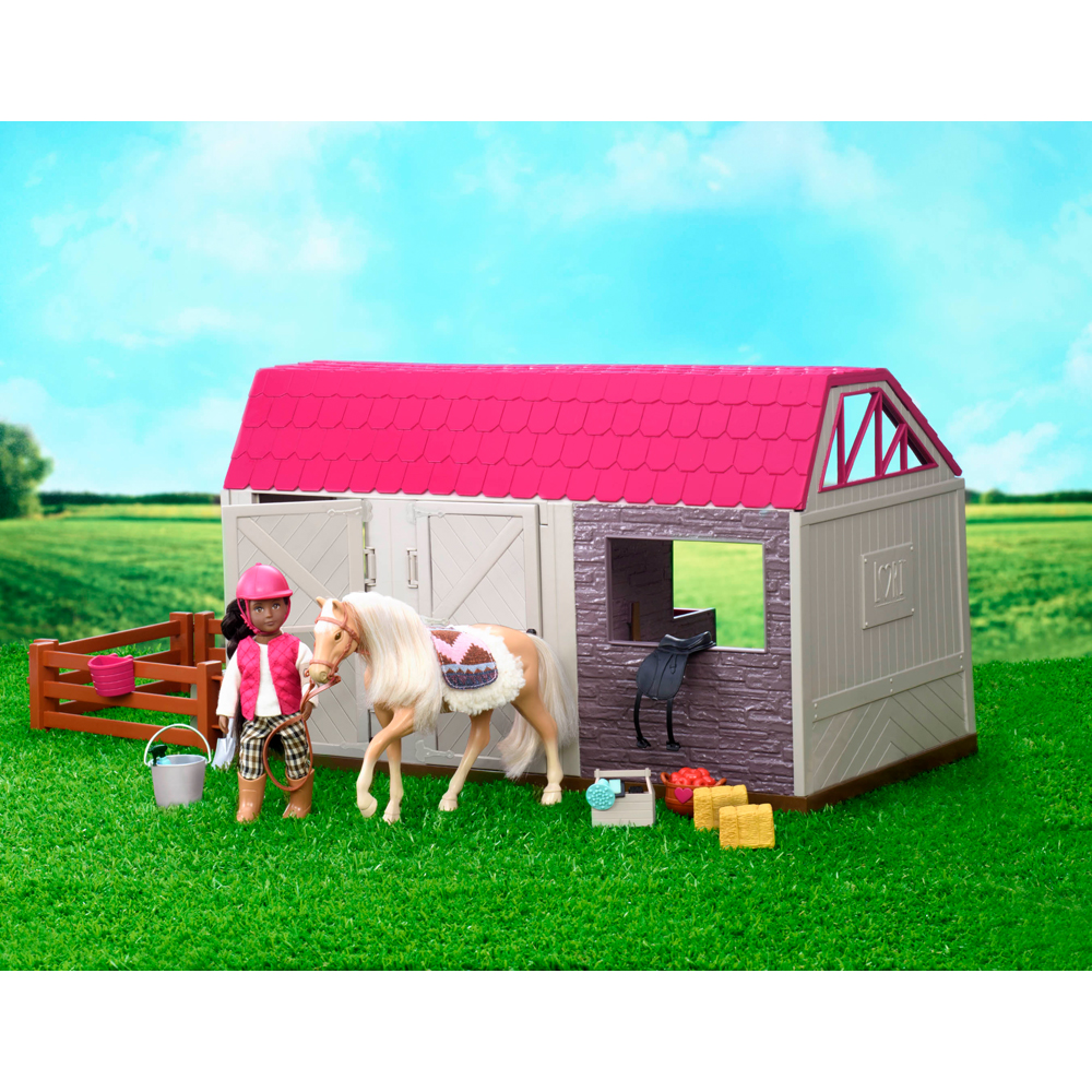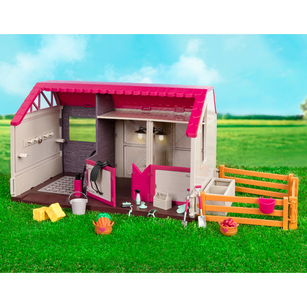 Zuhause ist dort, wo die Pferde sind, und die liebevolle Pflege deiner Mini-Pferde-Freunde war noch nie so lustig und aufregend wie mit dem Lori Pferdestall Horse Haven f 15 cm gro Puppen! Verwne deine Lieblingspferde mit diesem voll ausgestatteten Pferdestall mit allem, was deine Minipuppen f die Pflege von Pferden benigen. Schaffe mit den vielseitigen Znen einen Auslauf, einen zuszlichen Futterplatz oder einfach etwas mehr Raum. Die funktionierende Stallbeleuchtung hilft den Pferden, auch nach Einbruch der Dunkelheit eine gemliche Umgebung zu haben! Benutze beim Putzen die Hilfsmittel der Putzstation, um die Arbeit richtig zu erledigen - die funktionierende Pumpe versprt echtes Wasser! (Denke bitte daran, dass Lori-Pferde nichts gegen ein wenig Wasser haben, aber Lori-Puppen haben einen Stoffkper und sollten niemals nass werden). Heuballen, fel und Karotten sind die perfekten Snacks. Der Horse Haven Stall ist ideal f die Kollektion der Lori-Pferde und Reiterpuppen geeignet. Der Pferdestall hat funktionierende Leuchten sowie eine funktionierende Spritzwasserpumpe.