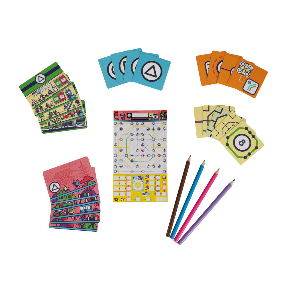 Inhalt: 100 doppelseitige Stadtple, 4 Buntstifte, 11 Stationskarten, 5 Karten "Gemeinsames Ziel", 4 Effektkarten, 4 Symbolkarten, Anleitung