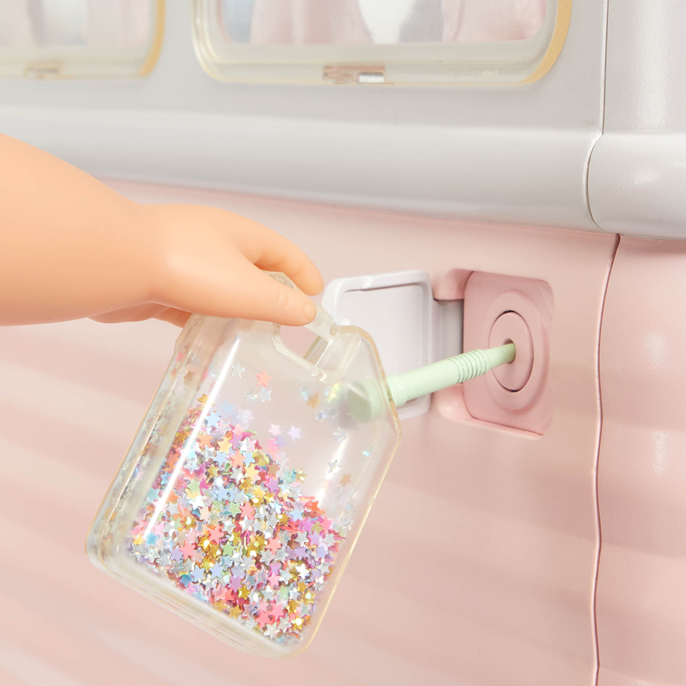 Dieses detailreiche Wohnmobil f 46?cm gro Puppen ist vollgepackt mit interaktiven Funktionen: funktionierende Lichter, ein bewegliches Lenkrad und Scheibenwischer, rollende Rer, eine hupende Hupe und ein GPS, das 8 verschiedene Sounds abspielt so wird jede Reise zum Abenteuer!