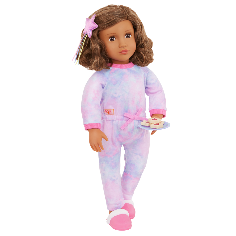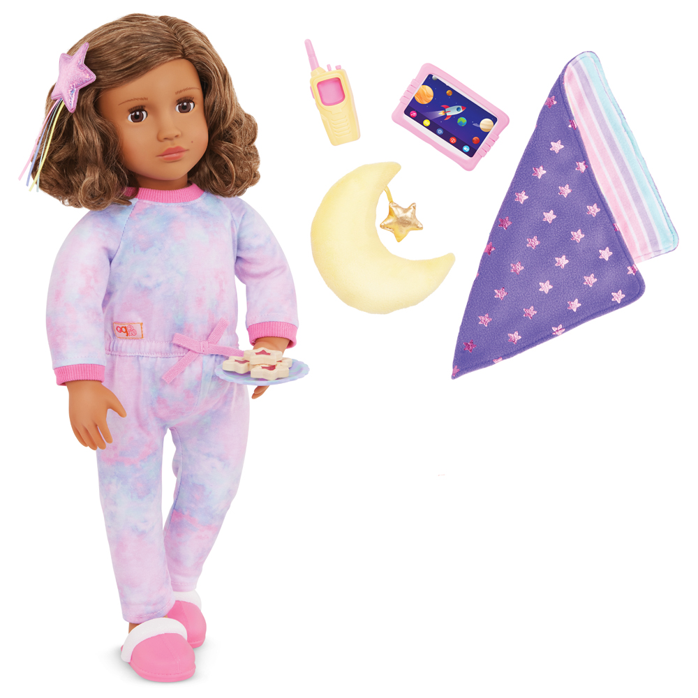 Verdopple den Spabei ernachtungspartys mit Luna und ihrem Bilderbuch! Diese Our Generation 18-Zoll Puppe kommt mit Schlafanzug-Zubeh wie einer Decke, einem Mondkissen, einem Cluster von Keksen, einem Spiel-Tablet und einem Walkie-Talkie. Ihr illustriertes Kapitelbuch lst Kinder mitlesen und mitspielen, wrend sie ihr Abenteuer nachspielen! Luna ist auch eine posierbare Puppe. Sie kann ihre Arme und Beine biegen, um lustige Posen wrend des Erzlens zu kreieren. Sie hat einen kuscheligen, weichen Kper, welliges braunes Haar, das sich prima stylen lst, und lebensechte hellbraune Augen, die sich wirklich schlien, wenn es Zeit f se Trme ist! Luna ist bereit f die ernachtungsparty und trt einen bunte Farbverlauf-Pyjama-Anzug mit sen Hausschuhen und einem Sternen-Haarclip. Die Our Generation Puppen- und Buch-Sets sind ein tolles Geschenk f Kinder ab 3 Jahren und fdern ihre Fantasie, wrend sie eigene, einzigartige Geschichten erfinden.