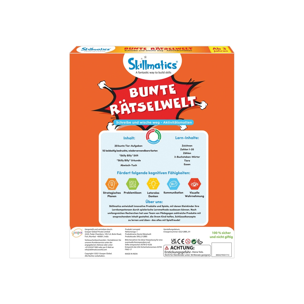 Beinhaltet 6 doppelseitige Matten, 1 Skilly Billy Stift, 1 Wischlappen, 1 Willkommensbrief, 1 Skilly Billy Urkunde